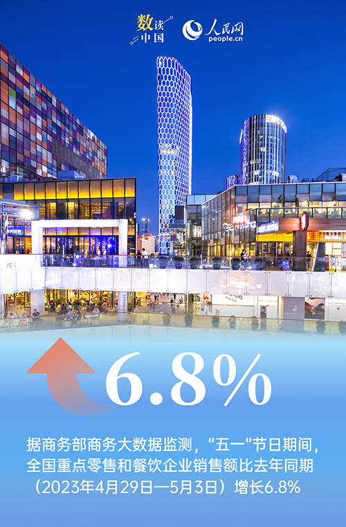 节日期间,消费市场繁荣活跃、亮点纷呈,呈现以下三个特点:一是消费市场活力足。据商务部商务大数据监测,节日期间,全国重点零售和餐饮企业销售额比去年同期(2023年4月29日—5月3日)增长6.8%。各地商圈人气旺盛,36个大中城市重点商圈客流量同比增长15.1%。线上消费较快增长,全国实物商品网上零售额同比增长15.8%。