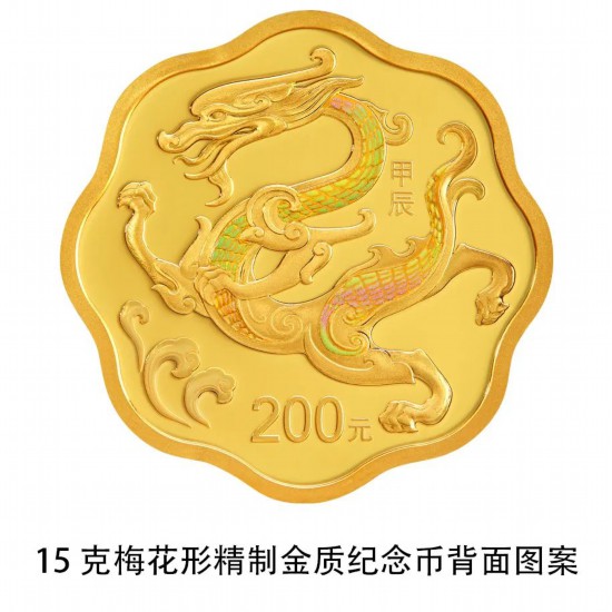 15克梅花形金质纪念币为精制币,含纯金15克,外接圆直径27毫米,面额200元,成色99.9%,最大发行量8000枚。